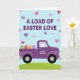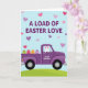 Designed with a spring scene in mind, this card features a deep amethyst pickup truck resting on a green hillside under a calm blue sky. Soft rose and violet hearts float overhead, and their gentle drift adds a sweet, affectionate tone to the moment 🌷. A long-eared white bunny 🐰 peeks from the cab window with rosy inner ears and a simple, friendly face, as if sharing a quiet, happy ride with you. In the truck bed sit four decorated eggs: one lime green with a cross, one red with wavy lines, one orange with horizontal bands, and one light purple with small dots. Across the top, the message “A LOAD OF EASTER LOVE” appears in plum lettering, centered and easy to spot. On the truck door, “Great Grandson” is written in a smaller, cursive-style line in a lighter tone, like a gentle note meant just for him. The hillside curves upward behind the truck, and the sky is dotted with the floating hearts above the roofline.