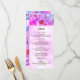 The wedding menu with a beautiful design with an orange butterfly touching white heart-shaped pearl beads. Another butterfly blends into the bouquet of pink, purple, and blue roses. Parchment paper image. Convert this for any occasion. Add a photo and/or change the text. Personalise this with your information.