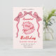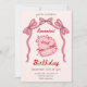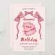At the heart of the invitation is a playful pink and red birthday cake, with a pink retro style bow frame. The typewriter-style font and flirty red text create a nostalgic vibe that's both timeless and fun.