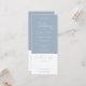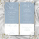 An all-in-one wedding invitation featuring elegant heart script typography on a dusty blue background. The invitation includes an RSVP card that can be cut off and guest information details. Designed by Thisisnotme©