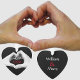 A couples' hands meet and form a heart on this Christmas ornament in bold black and white with red year to be personalised for first Christmas or current year. The hands are sketched against a black background. On the reverse side, again in red, are your personalised Names of the couple. A romantic loving gift to give.