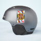 This vinyl sticker is a playing card of the queen from the heart suite with done bright colours of yellow, red and blue with red hearts on a white background.