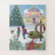 Sweet holiday puzzle. Capture the nostalgic charm of an old-fashioned Christmas with this heartwarming illustration featuring children playing with a joyful pup in the snow. Set against the backdrop of a snow-covered house, the scene is illuminated by a large, twinkling Christmas tree, evoking timeless holiday magic. Perfect for celebrating the joy of a classic holiday season filled with warmth, wonder, and family fun. Christmas puzzle by judithchengart