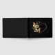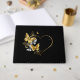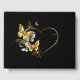 Gold heart shaped frame, decorated with gold, jewellery and white butterflies on black background.