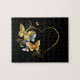 Gold heart shaped frame, decorated with gold, jewellery and white butterflies on black background.