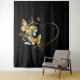 Gold heart shaped frame, decorated with gold, jewellery and white butterflies on black background.