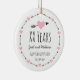 A pattern of illustrated black arrows and pink hearts circle this personalised celebratory ornament. Handwritten style text lists a number of years, the names of two people, the words Happy Anniversary, and a wedding date. You can try different background colours by clicking the Customise button. It makes a romantic gift for a special couple!