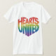 This t-shirt features the message "hearts united" in a vibrant rainbow gradient. Each letter bursts with a different colour, creating a message of unity and inclusivity.