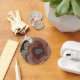 Keychain with "Heartsick," by Susan Wallace. Copyright © 2008, Susan Wallace. A skewed and ruffled heart of vivid pink and red rests on a background of shades of deep blue.