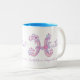 Decorated hand drawn letter with your own name beginning with H and name meaning mug. Pretty heart and flower capital H doodled typographic design featuring hearts and flowers and the words Heather Beautiful flower. Independent & compassionate in blue, pinks and purple colors. © Unique art and design by Sarah Trett for www.mylittleeden.com on zazzle
