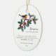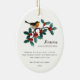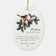 Heaven and Nature Sing Winter Bird on Holly Ceramic Oval Christmas Ornament... A sweet winter bird perches atop colourful sprigs of red holly berries on our vintage style oval ceramic Christmas ornament with the heading "Heaven and Nature Sing" in script and classic serif typography. A heartfelt Christmas greeting reads: "Wishing you peace, love, and joy this holiday season and throughout the coming new year." Personalise with your signature and year just below the holiday wishes. All text can be easily revised on the personalisation template.