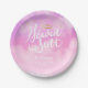 Sweet Christian or angel theme baby shower paper plate featuring pink and purple sky with whimsical cloud and faux gold stars. The text says "Heaven Sent" in hand written script font. There is a gold halo above the text. Customise this product by adding your own baby shower information.