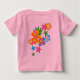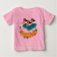 Adorable cartoon of three hula girls dancing surrounded by a floral lei.This design is available in another colorway as well. This original cartoon adorns these toddler t-shirts on the front with a companion print of a cluster of flowers on the back. These designs come in several colorways.