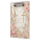Organise her plans and projects in a clipboard of divine elegance with the Heavenly Blush & Gold Quince personalised clipboard with photo. The front of this beautiful clipboard features a serene and spiritual design with soft blush tones, delicate floral accents, and shimmering gold details. The beautiful illustration includes graceful doves in flight and a magnificent golden cross. On the back, you can add your very own cherished photograph, making this clipboard a truly unique and deeply personal keepsake.