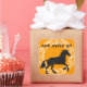 Cute black silohuette of a horse against a mustard yellow background and encircled in a vintage style circle. The words, "Yom Huledet Sameach" (Happy Birthday in Hebrew) match the black silohuette.