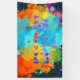 The Hebrew word "shalom" (meaning 'peace' but also 'hello') in an artsy form over a colourful paint splashes background.