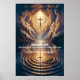 A breathtaking scene of a vast, serene lake surrounded by towering mountains. Above the lake, a magnificent cross is suspended amidst a backdrop of swirling, golden clouds that radiate a divine glow. Rays of light pierce through the clouds, illuminating the scene below. In the foreground, the lake's calm waters reflect the cross and the surrounding landscape, creating a symmetrical visual effect. On the lake's surface, there's a ripple pattern, and a chain is seen submerged, creating a sense of depth and mystery.
