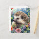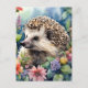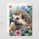 Postcard features wild animal portrait of a hedgehog looking left, surrounded by lots of colourful flowers. A floral botanical artwork featuring a small spiky mammal, popular as an exotic pet!