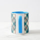 A fun Blue and White Ceramic Ringer Coffee Mug, with Burgundy Red, Beige and Dark Blue Madras Check Pattern. Part of the Posh & Painterly 'Heffalumps' collection.