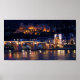 A photograph of the beautiful city of Heidelberg at night. The Heidelberg castle can be seen up in the mountains and underneath it is the lit up old bridge and gate.