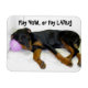 This adorable magnet features our German Rottweiler puppy, Heidi. After playing with her purple ball, Heidi decided to take a little nap but she refused to leave her favourite toy. She is seen here looking sleepily into the camera with her head resting on her purple ball. This magnet is perfect for all dog lovers especially those who understand the wonderful energy of a puppy and the naughty things they do when they aren't played with enough. This magnet says: Play NOW, or pay LATER!