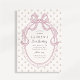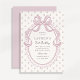 Elegant first birthday invitation featuring a delicate floral pattern and an heirloom-style pink bow frame. The scalloped oval design and timeless botanical details create a refined cottagecore look, perfect for classic first birthday parties and vintage-inspired celebrations. A charming choice for a floral bow first birthday invitation with a soft, traditional feel.