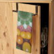 This dish towel features a kaleidoscope arrangement of red, yellow, and orange heirloom tomatoes with cucumbers and parsley.