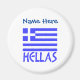 Round magnet shows the Greek flag and the word, HELLAS, below in blue. The flag shows blue and white stripes with a blue and white cross in the upper right area. Above it, add your name, also, in blue letters, for a personalised touch or create a gift. Great for celebrating Oxi Day.