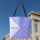 The Greek flag and the word HELLAS below in blue, tiled diagonally for an artistic look.. The flag shows blue and white stripes with a blue and white cross in the upper right area. A white, textured space of squiggly squares holds a spot for your name to personalise this tote bag or create a gift. Fun for travelers. Great for celebrating Oxi Day.