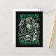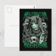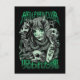 A fierce horned demon girl with stitched lips and green glowing eyes, framed by skulls and serpents. A heavy metal inspired design with a dark fantasy twist.