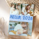 Whimsical and modern New Year's photo template card featuring a typography text that says "Hello, 2026" with 3 of your pictures. You can add another picture and a message on the back of the card. Icy blue color.