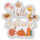 A warm and cosy illustration with the phrase “Hello Autumn” surrounded by fall elements like pumpkins, candles, autumn leaves, mushrooms, acorns, and a cup of hot chocolate. This charming seasonal design captures the beauty and comfort of autumn, perfect for celebrating the fall season.