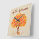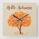 Square wall clock featuring an image of autumn maple tree and leaves falling on ground with quote "Hello Autumn" above the tree.