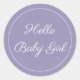 A simple cute "hello baby girl" gift sticker for a new baby gift. Text in script font. White script on pastel violet.