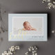 A sweet and elegant gender neutral birth announcement design featuring a full bleed horizontal or landscape orientated photo bordered in white, with "hello" at the lower left in gold foil handwritten script lettering. Your baby's name, birth stats, and a personal message appear at the lower right. Add three additional square photos to the back.