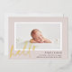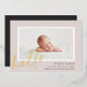 A sweet and elegant gender neutral birth announcement design featuring a full bleed horizontal or landscape orientated photo bordered in white, with "hello" at the lower left in gold foil handwritten script lettering. Your baby's name, birth stats, and a personal message appear at the lower right. Add three additional square photos to the back.