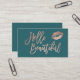 A modern, stylish custom name beauty business card with modern hand lettering style elegant brush typography saying Hello beautiful in faux rose gold foil on a trendy and elegant teal background with a rose gold lips . If you need any customisation, don't hesitate in contacting me