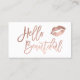 A modern, stylish custom name beauty business card with modern hand lettering style elegant brush typography saying Hello beautiful in faux rose gold foil on a simple white background with a rose gold lips . If you need any customisation, don't hesitate in contacting me