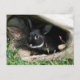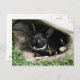 Black otter coloured bunny rabbit peeking out of a hollow log