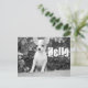 Aww...who can resist the sweet face of a Chihuahua puppy dog? This fun Hello canine postcard features a black and white image of a happy Chihuahua puppy dog playing in a flower garden.