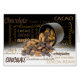 The cover design is adorned with chocolate bits and almonds spilling from a black ramekin with a horizontal black and white background and a text block of the words chocolate, dark chocolate and almonds in English, German and French plus more words in a variety of font styles, sizes and colours. Customise the inside greeting with your message or remove the text.