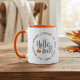 This two-toned mug features a beautifully scripted "Hello Fall" in a circle of autumn's favourite activities: Bonfire, Pumpkins, Hay rides, Apple Cider, and Cosy Sweaters.