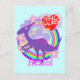 Hello Flower Purple Dinosaur Postcard. A cute little purple cartoon dinosaur Dilophosaurus with flowers and rainbow colours and a red heart saying "I love Dinosaurs" postcard. This great dinosaurs postcard is fully customisable! Change the text "Hello!" and add your images & texts! A happy little Hey Hello flowers dinosaur card, send to a dino fan!