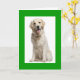 Aww who can resist the sweet face of a happy Golden Retriever puppy dog? This fun Hello greeting card features a blonde yellow Golden Retriever pup sitting on a white background with a green frame.