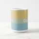 This cool mug features a khaki colour palette in khaki tan, sage green and slate blue with word Hello on one side and Goodbye on the other. You can change the text to your name or other ideas.