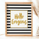 Beautiful modern trendy typography brush script quote. "Hello Gorgeous". Featuring a pretty gold metallic glitter frame and gold letters with black and white stripes.