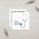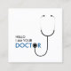 A double sided square business cards design for medical staff, such as doctors and general practitioners. The front of the design shows an introductory line saying "Hello, I am your doctor", with a stethoscope using the chest piece to replace the second "O" in the word doctor. The back of this modern square business card shows your name, occupation and all your contact details.