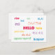 A fun and colourful post card that says hello in many languages like English, Italian, Norwegian, Japanese, Spanish and more!