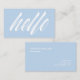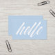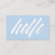 Custom business cards feature the word "hello" in a modern white cursive script font on light blue. The business card back features your name, job title/speciality/company, website, and contact information in white text on light blue. Replace the sample text with your own in the sidebar.