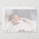 Announce and welcome your new baby to the world with our simple and modern hello baby photo birth announcement card. The design features a single full photo layout to display your new baby's photo. A light white overlay is placed over the photo with "hello" overlay in a simple white script. The reverse side features a simple faux gold heart with the baby name, birth date, birth stats, and custom message displayed neatly with a simple border.